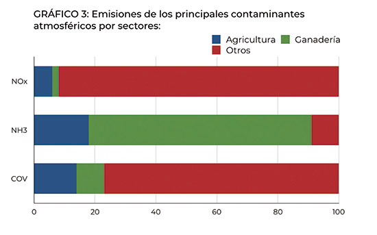 Tan solo el 2 % de las emisiones totales de gases de efecto invernadero son atribuibles a la ganadería porcina, ya que la mayoría de las de CH4 del sector ganadero se atribuyen a la fermentación entérica de los rumiantes. Respecto a las emisiones de contaminantes atmosféricos, cabe destacar las de NH3.